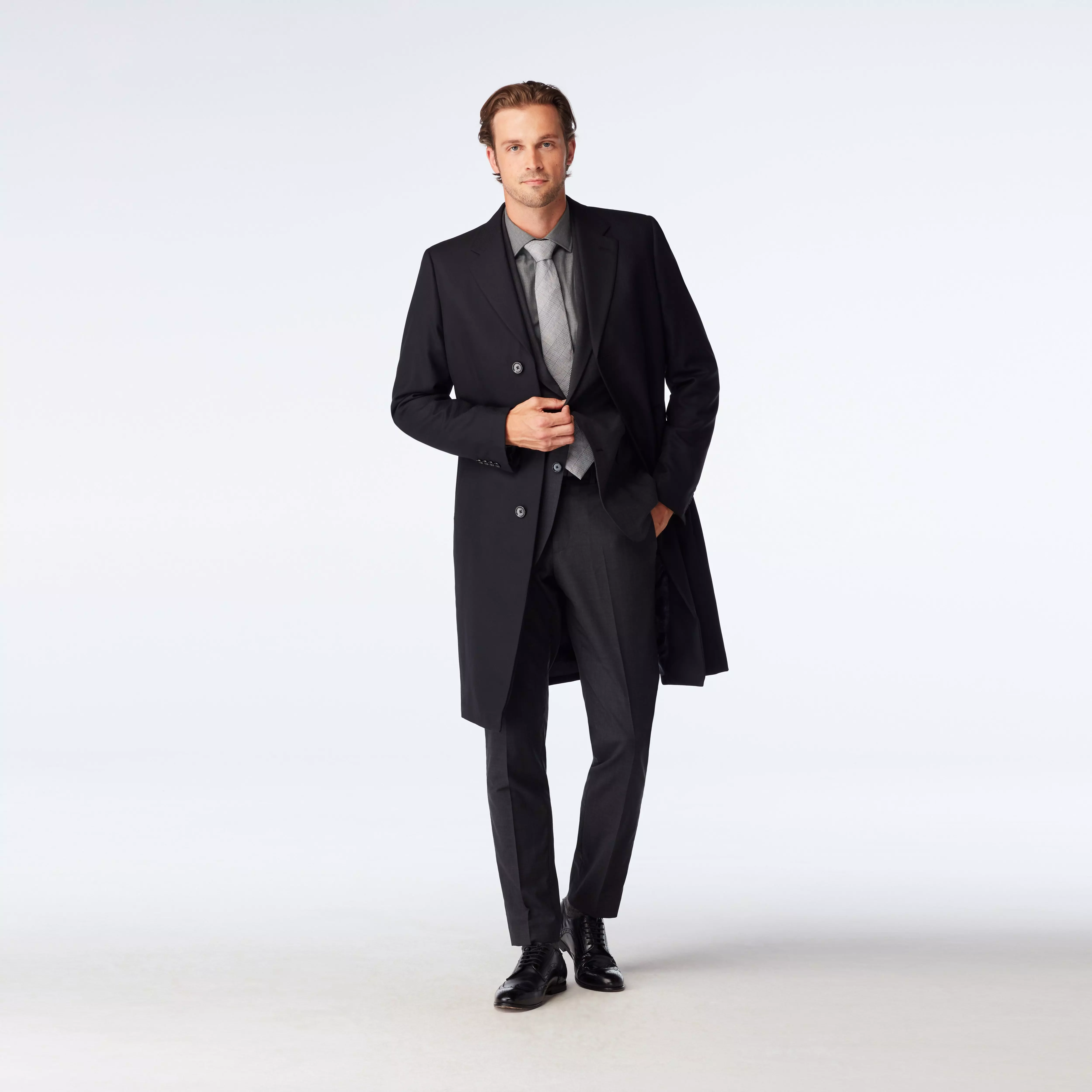 Woven from durable, lightweight wool, the Hatton is a breathable black overcoat designed to be worn where the weather's a little warmer. And with a quilted lining, you can crank up the heat whenever you need it. In addition to being custom made to your unique measurements and specifications, this overcoat is thoughtfully constructed from high quality merino wool. All our coats are half canvassed for greater versatility and superior shape for your body, and are constructed fromwool for optimal warmth. Each coat also features fully canvassed lapels, bullhorn buttons, standard shoulder pads, and high quality collar felts