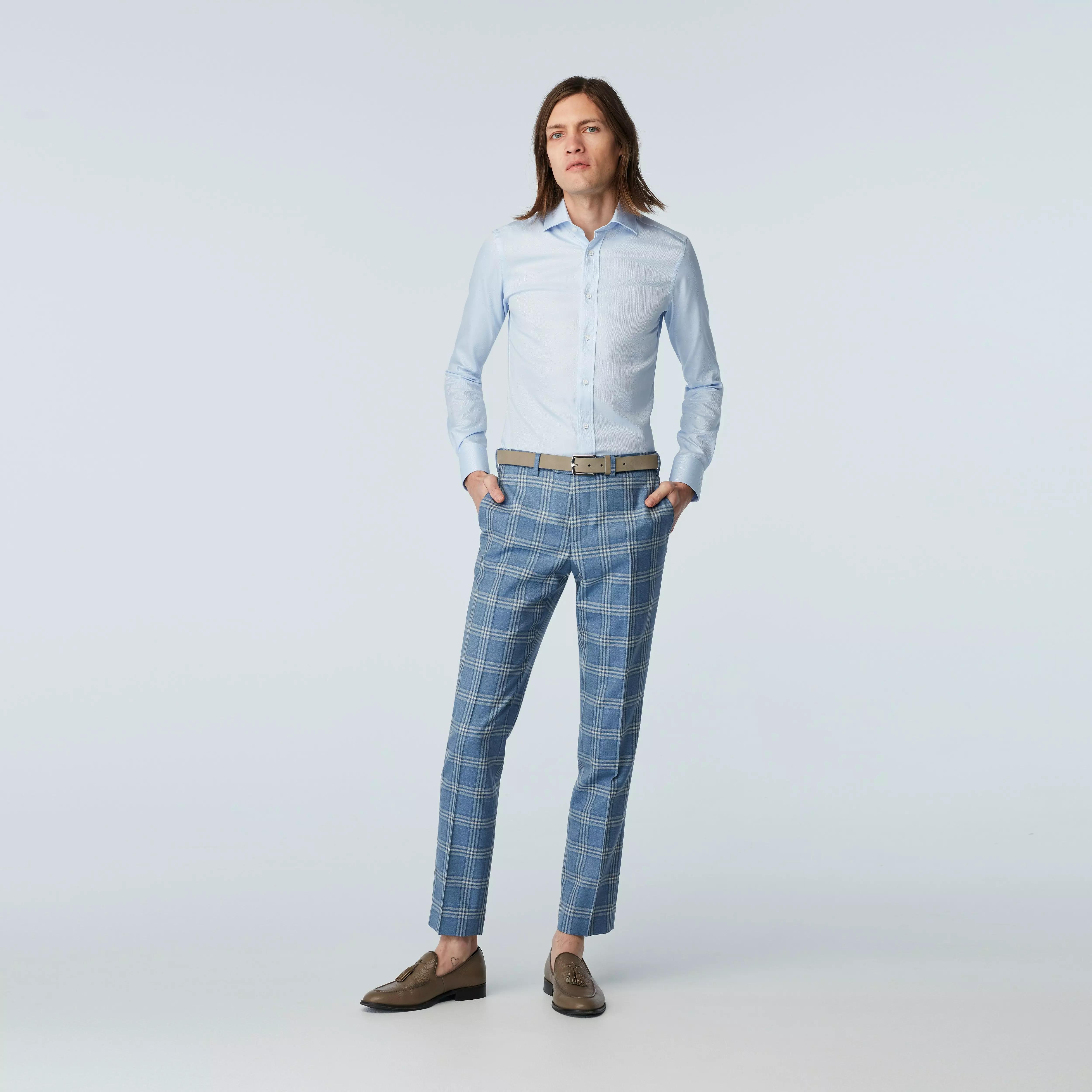 The Lifton plaid speaks to both contemporary and classic UK tailoring. Done in a light blue for spring, this fabric is a go-to for wedding season and the weekends. In addition to being custom made to your unique measurements and specifications, these pants are thoughtfully constructed from high quality components. All our pants are half lined for added comfort, and feature bullhorn buttons, 4 pockets, and hook & bar closures.