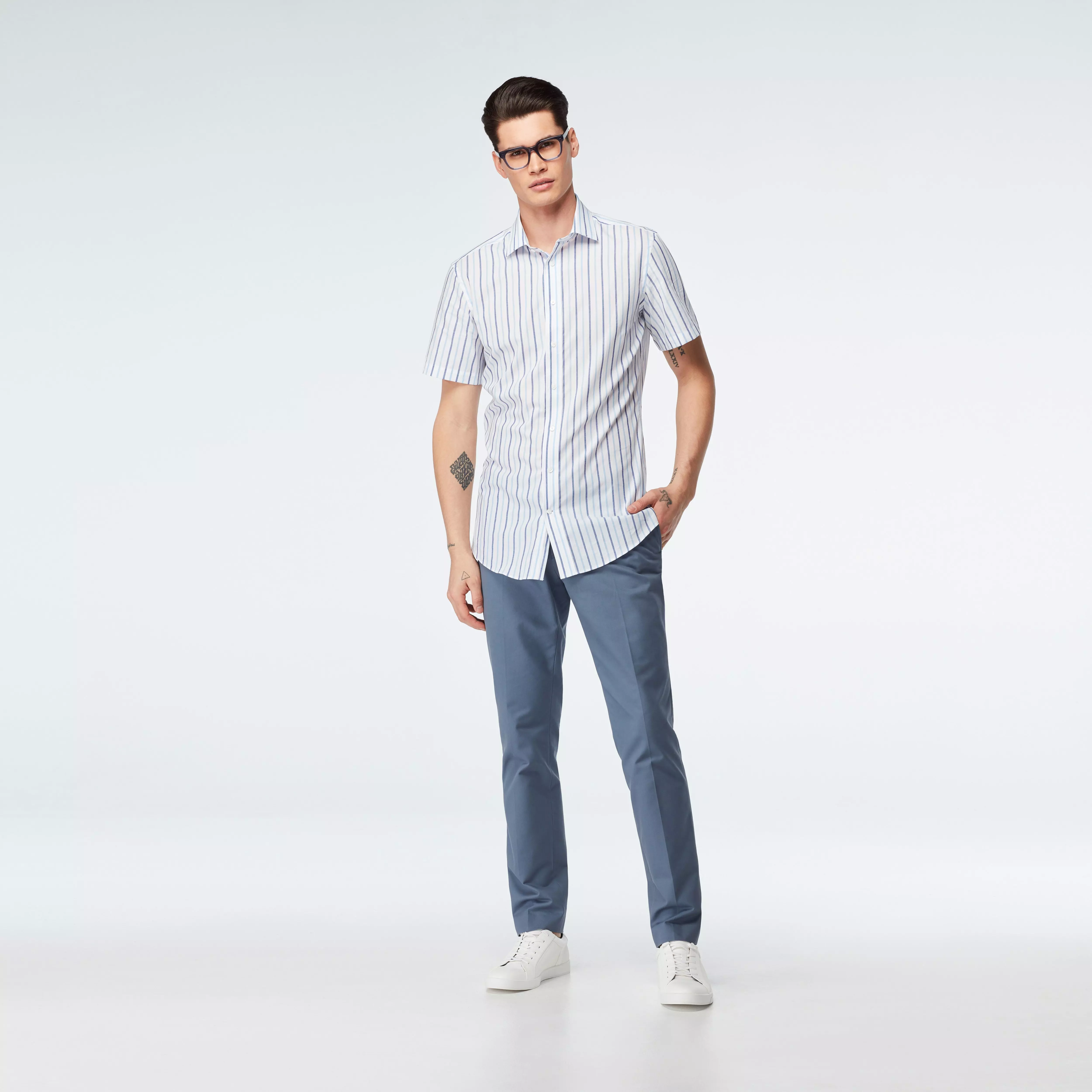 The Stroud Shirt's vertical stripes will strengthen your silhouette and keep you looking fresh. Easy to care for and easy to wear, Indochino shirts can be customized to have long or short sleeves, as well as a tucked or untucked torso length.